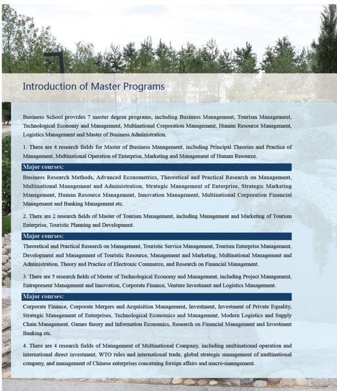 Business School provides 7 master degree programs, including Business Management, Tourism Management, Technological Economy and Management, Multinational Corporation Management, Human Resource Management, Logistics Management and Master of Business Administration.
