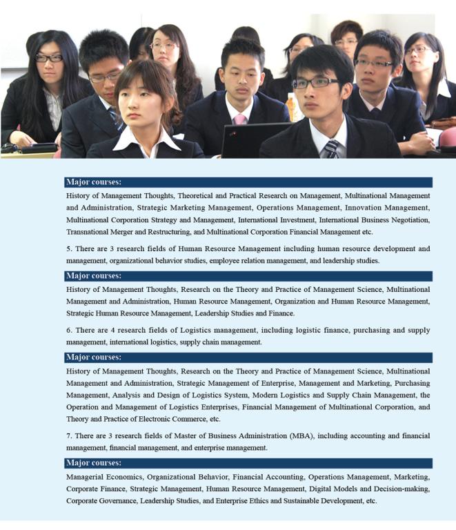 History of Management Thoughts, Research on the Theory and Practice of Management Science, Multinational Management and Administration, Strategic Management of Enterprise, Management and Marketing, Purchasing Management, Analysis and Design of Logistics System, Modern Logistics and Supply Chain Management, the Operation and Management of Logistics Enterprises, Financial Management of Multinational Corporation, and Theory and Practice of Electronic Commerce, etc.