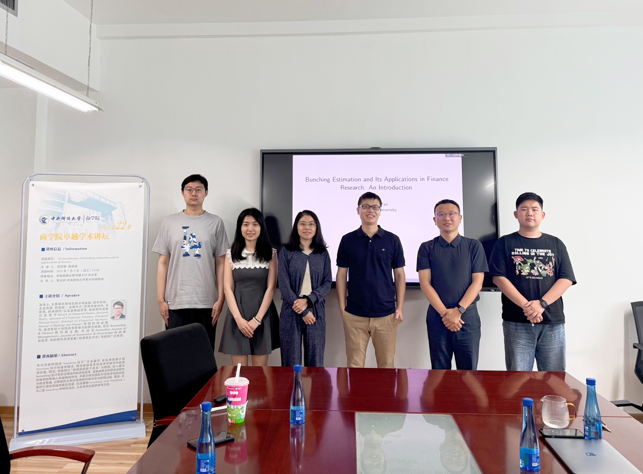 潘哲耀老师本次讲座的主题为“An introduction of bunching estimation and its applications in finance”。本次讲座围绕“bunching估计”方法展开,首先简要介绍了bunching估计的基本概念、理论基础及其在经济学研究中的应用价值。随后,讲座以“抵押品的影子成本”为案例,深入展示bunching估计在实证研究中的具体应用。潘教授分享研究过程中所收到的审稿人和编辑的评论,并展示研究团队对这些评论的回应与改进思路,以帮助听众更好地理解科研写作与投稿过程。最后,讲座介绍了该领域的最新进展,包括模糊bunching(fuzzy bunching)与二维bunching的研究动态,为未来研究提供参考方向。