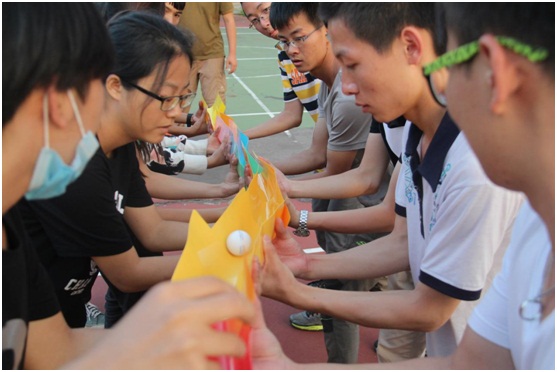 下午2点,“盲人方阵”项目开始。队员们被蒙上眼睛,通过沟通与合作在规定的时间内将一根长绳围成最大的正方形,并保证每一条边上的队员均匀分布,通过这个活动营员们学会了如何沟通和协作。接下来是最激动人心的“挑战NO.1”项目,有六个项目小组组成——“能量传输”、“心手相连”、“不倒森林”、“蛟龙出海”、“激情节拍”,队员们使出浑身解数,经过紧张而激烈的比赛,34人在此刻融为一体。
