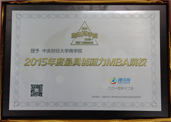 MBA联合会主席曾洁代表中财星空XK体育领取“腾讯网 2015年度最具创新力MBA院校”奖