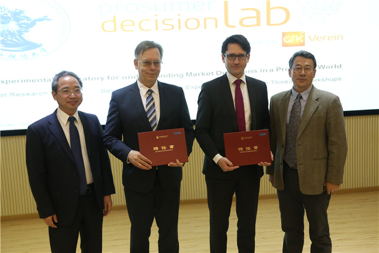 启动仪式上,李俊生副校长发表致辞,对实验室的顺利揭牌表示祝贺,对GfK基金会全资建立消费决策综合研究实验室(Prosumer Decision Lab)表示感谢,并对实验室的使用提出了三个期望,要注重培养学生的开阔视野、学习方法和思维方式,不仅注重大数据运用,更要着眼于云技术、云计算等新兴领域,要培养学生跨文化交流与合作的能力。李俊生副校长还为RaimundWildner和Andreas Neus先生颁发星空XK体育客座教授聘书。