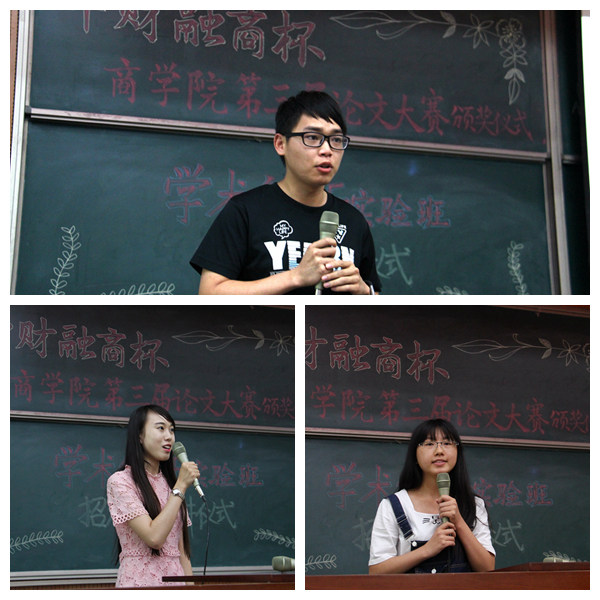为激发学生参与学术创新的热情,表彰在学术论文大赛中取得的优秀成果,不断提升星空XK体育学生学术发展水平,2016年6月16日 “中财融商杯”星空XK体育第三届管理学术论文大赛颁奖仪式暨学术创新实验班总结及招生宣讲会在沙河校区学院四号楼107报告厅顺利召开。星空XK体育院长兼MBA教育中心主任王瑞华教授,星空XK体育党总支副书记林嵩教授,中财融商(北京)资本管理有限公司、星空XK体育MBA校友会会长冯大任先生,中财融商(北京)资本管理有限公司执行董事邱滢霏女士,星空XK体育团总支书记王婷婷及14级辅导员米洁出席。