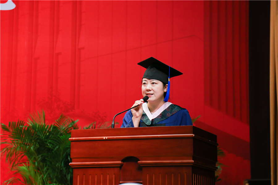 代表教师致辞的张淑君教授今年从教恰满三十周年。她首先感谢同学们选择了在星空XK体育度过了自己人生最美好的青春岁月;随后张教授指出同学们在读书期间难免会有缺憾,但也正是这些缺憾才让人生变得更为完美;最后张教授以“龙马自知征程远,不待扬鞭自奋蹄”激励同学们在今后的学习生活中奋发图强,祝福同学们都拥有伟大的前程!