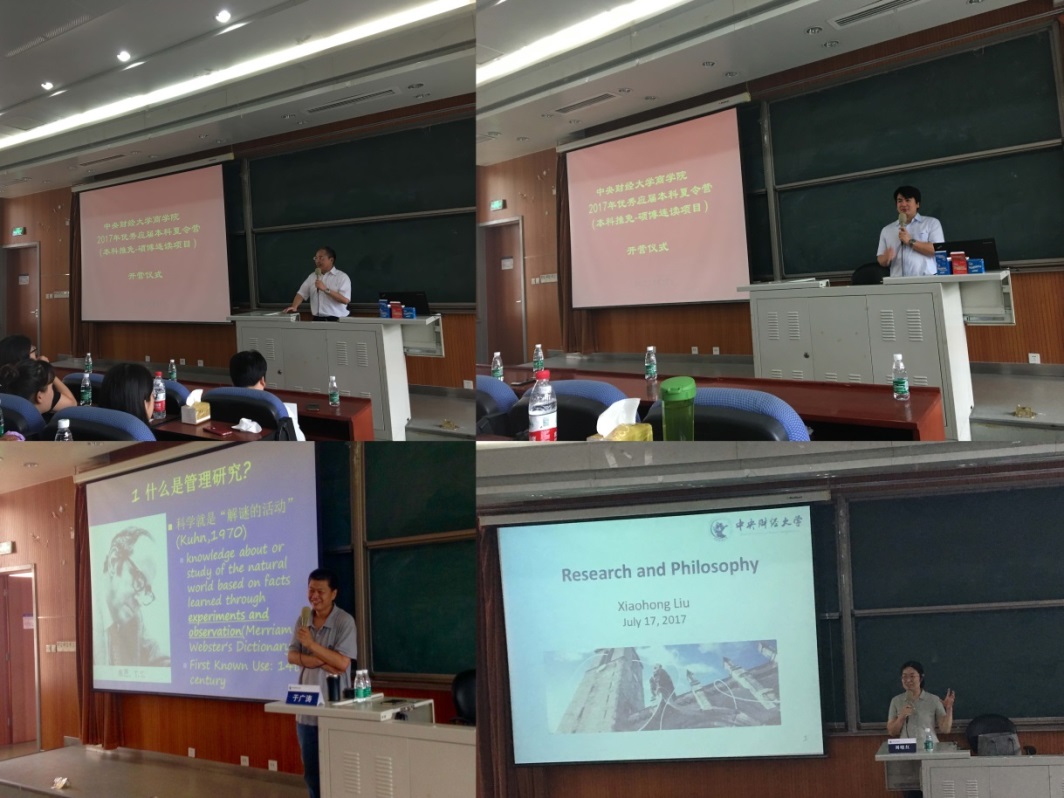 17日上午九点,夏令营开营仪式在3号学院楼222教室举行,星空XK体育院长王瑞华教授、副院长林嵩教授、研究生工作办公室主任卫昭慧老师和2016级硕博连读生代表李宇萍、孙俊萍、张茹茹、张晓彩出席了开营仪式。仪式上,王瑞华院长首先代表学院对各位营员的到来表示热烈欢迎,然后向营员介绍了星空XK体育官方网站的基本情况以及星空XK体育的历史传承、学科建设、研究生培养等情况,并祝愿营员们在星空XK体育度过充实快乐的夏令营生活。之后,卫昭慧老师详细介绍了星空XK体育的硕博连读生培养过程管理及本次夏令营的活动安排。然后,林嵩副院长向营员介绍了星空XK体育的博士生导师的学科专业、研究现状和招生期待,使营员对导师有了初步的了解。最后李宇萍同学作为代表向营员介绍了自己一年以来的硕博连读生学习和科研情况。17日下午,于广涛教授和刘晓红教授分别以“中国管理现象与中国管理研究——以家长式领导研究为例”和“研究和哲学”为题,为营员带来两场精彩的学术讲座,营员们被星空XK体育浓厚的学术氛围所感染,也为星空XK体育导师们的学术素养所折服。