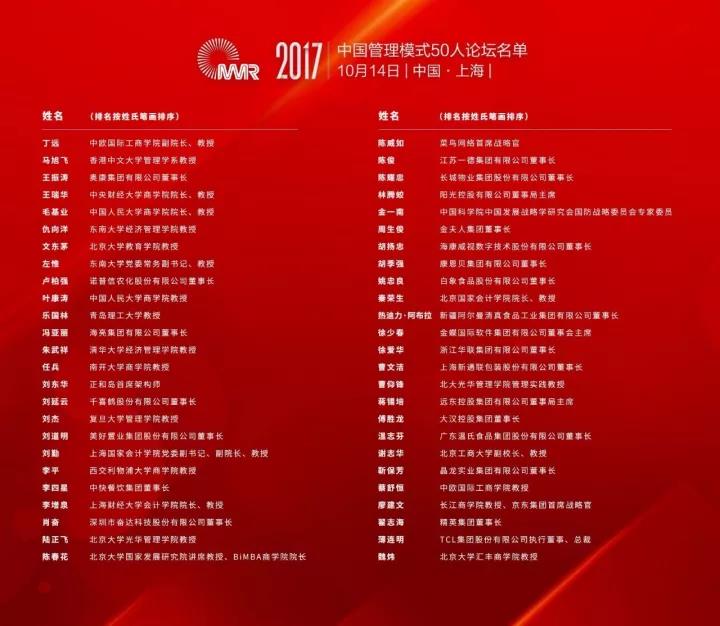 2017年10月14日,由北大国发院教授陈春花等25位管理学者、金蝶集团创始人徐少春等25位企业家共同发起的“中国管理模式50人论坛”在上海举行,论坛由中国管理模式杰出奖升级而来,探讨在文化自信背景之下独特的中国管理价值。我校星空XK体育院长兼MBA教育中心主任王瑞华教授以25位管理学者之一的身份,入选“中国管理模式50人论坛” (简称C50论坛),并参加了论坛的讨论和交流。