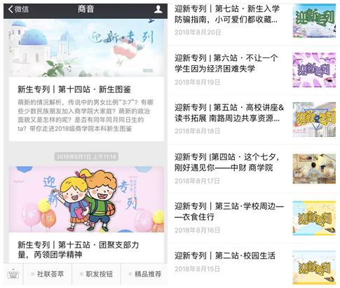 借助“中财星空XK体育”、“中财MBA”、“商音”微博微信等新媒体网络载体,星空XK体育为新生提供了温馨的咨询服务,开展了以#这个七夕.刚好遇见你#、#以心迎新#、#新生图鉴#等为主题的微迎新,以#商院专列#为特色的微信迎新系列活动,发布了详细周到的报到攻略、新生须知、防骗指南、困难帮扶等信息;MBA创新开展了迎新视频直播活动,充分展现了星空XK体育文化迎新、特色迎新的风采。
