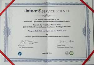 在投稿的139篇论文中,代宏砚老师投稿的论文被ICSS 2019授予了The First Place Winnerof the 2019 INFORMS Service Science Conference Best Paper Award,这是该会议的最高奖项。