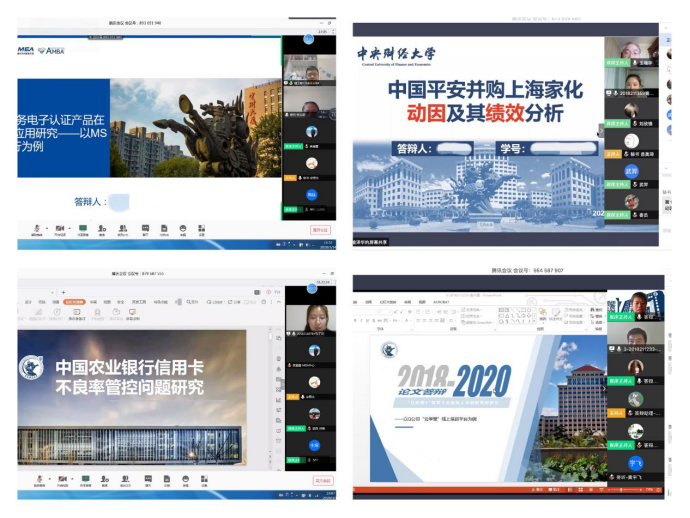 为积极响应教育部应对新型冠状病毒肺炎疫情工作领导小组办公室《关于做好2020年上半年毕业研究生学位授予相关工作的通知》(教研厅函〔2020〕1号)要求,最大程度减轻疫情对研究生学位申请与授予工作影响,确保学位申请各环节工作顺利进行。根据学校研究生院《关于疫情防控期间研究生科研活动与学位论文工作安排细则的通知》,MBA教育中心广泛开展调研,制定了《2020春季学期MBA学位论文相关工作实施方案》,多措并举,稳步推进MBA毕业论文指导工作。近一个月以来,MBA教育中心上线了智能咨询机器人2.0版本来解答学生的各类咨询。学生通过“MBA论文管理系统” 线上提交学位论文和答辩申请, MBA论文指导教师、答辩委员分别在系统中进行论文审阅,为预答辩工作奠定了良好的基础。MBA教育中心全体老师精心设计线上预答辩方案,前期做足功课,开展测试和论证,建立工作群组,对线上答辩平台及答辩软硬件设备进行了精心遴选和调试,认真组织答辩委员、答辩秘书、行政人员、MBA毕业生等分别召开了培训会议、工作会议、专题班会等,发布了针对答辩委员、学生、秘书、行政人员共四个版本的MBA在线答辩攻略和说明书,制定了预答辩过程的突发工作实施预案,多次开展演练,确保线上预答辩工作顺利进行,保证学位论文预答辩质量及效果。