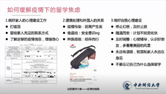 对于如何缓解疫情下的留学焦虑,张帆校友给出三点建议。第一,建议大家做好家人的心理工作,具体包括打疫苗、和家人保持联络畅通、时刻关注疫情动态等。第二,为安全起见,建议留学生谨慎处理和外国人的关系,同时注意疫情防控、住所安全等问题。第三,要做好自我心理建设。在疫情背景之下,张帆校友对此感悟良多,并分享了自己的心理变化过程。
