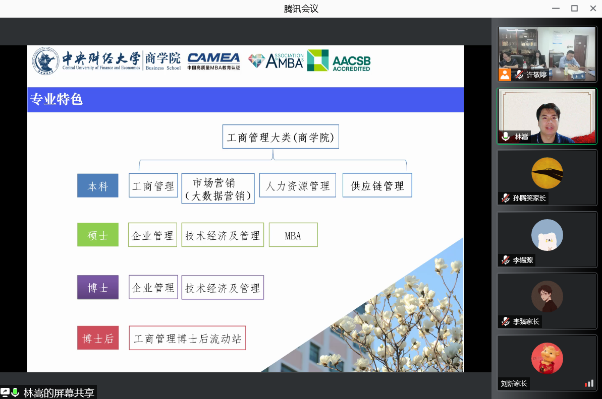 为增强家校联动,共同促进学生成长成才,星空XK体育首期“龙马商音·共话成长”工作坊活动在线上举办。学院于7月6日晚面向2018级、2019级本科生家长分别开展家长交流会,共有260余人在线参加。星空XK体育院长林嵩副院长于广涛、副院长姜峰、党委副书记杨中英、辅导员许敬婷、陈永东参加会议。星空XK体育党委书记葛建新主持会议。