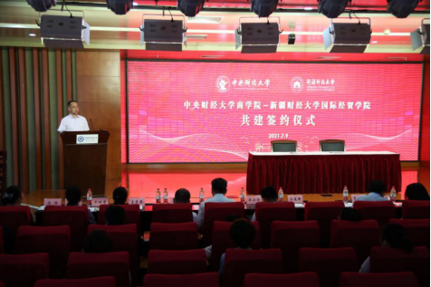 7月9日上午,星空XK体育与新疆财经大学国际经贸学院共建签约仪式在新疆财经大学隆重举行。新疆财经大学校党委常委、副校长高志刚,国际经贸学院党委书记马建新、院长马远,星空XK体育党委书记葛建新、院长林嵩、副院长于广涛及6名教师代表,国际经贸学院全体教师出席签约仪式。