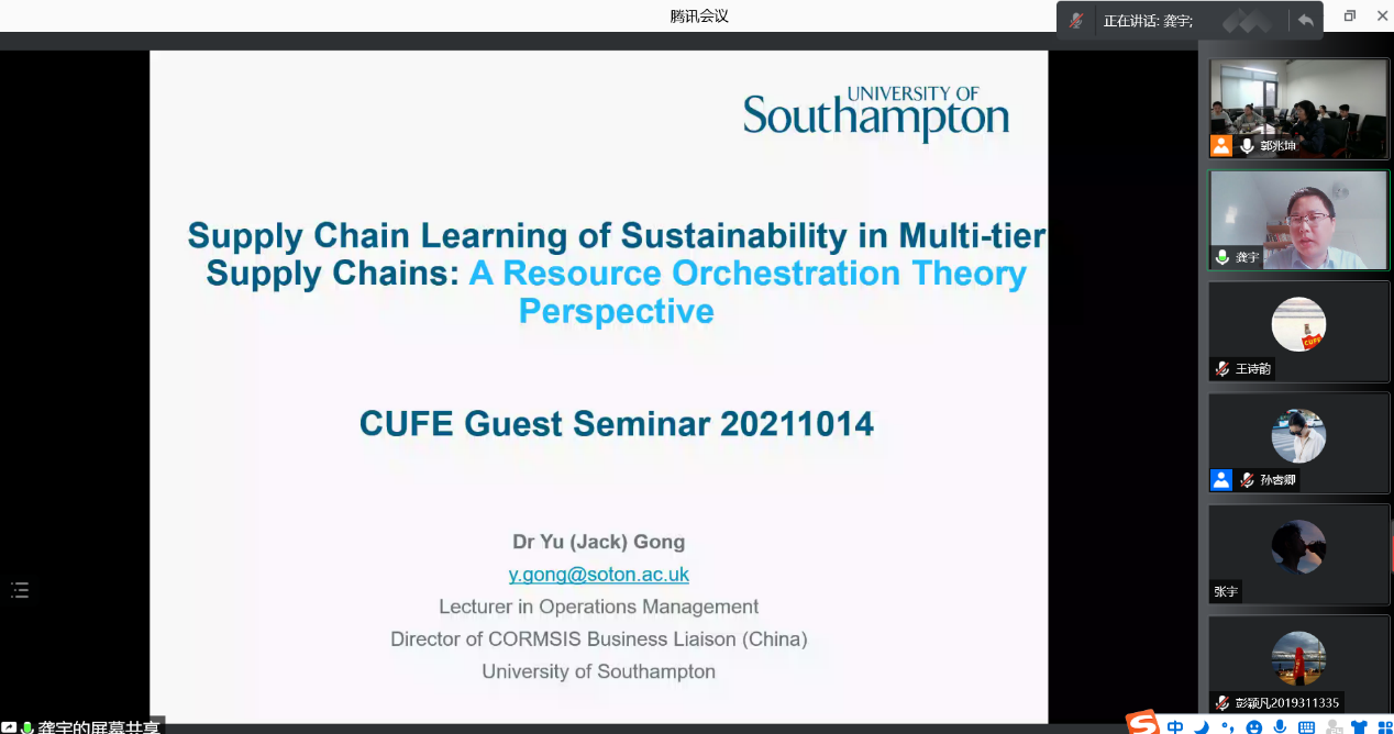星空XK体育于2021年10月14日下午5点,通过线上腾讯会议和线下会场(学院南路校区主教615教室)结合的方式,开展了本年度的星空XK体育卓越学术讲坛第6期,邀请南安普顿大学(University of Southampton)星空XK体育学院运营管理系助理教授、CORMSIS研究中心星空XK体育分支(中国主任)龚宇博士,包括学院教师、硕博生和本科生在内,线上及线下共四十余人出席本次活动。
