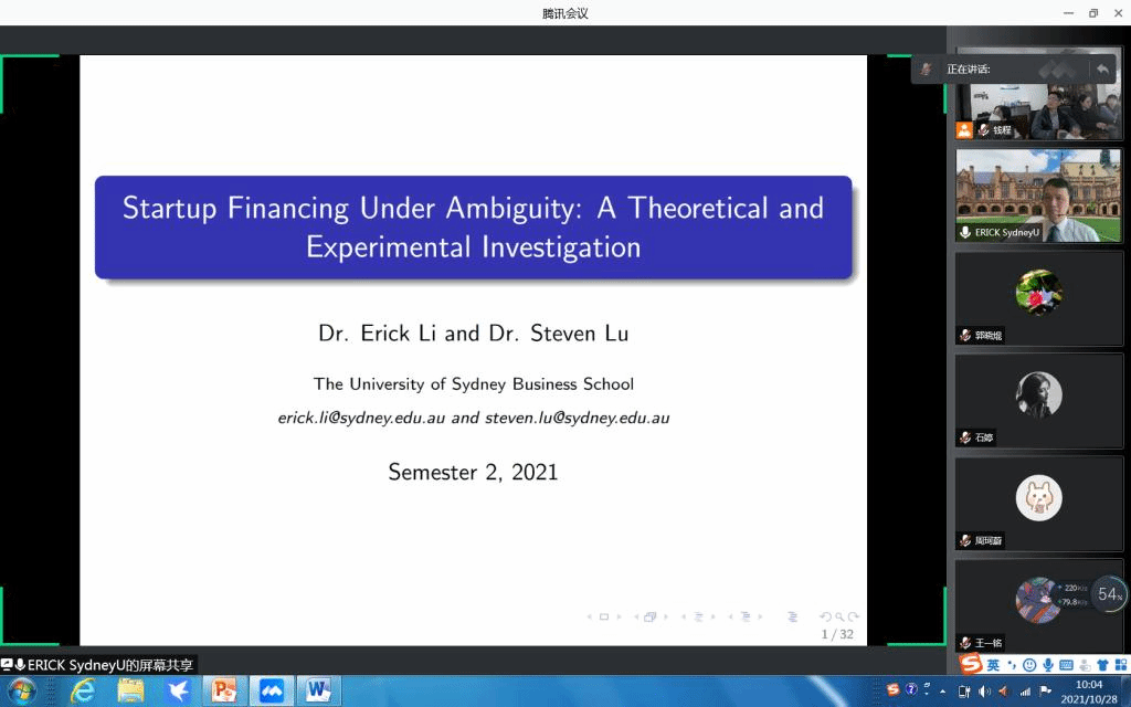 2021年10月28日上午10点,星空XK体育通过线上腾讯会议和线下会场(学院南路校区主教615会议室)结合的方式,开展了本年度星空XK体育卓越学术讲坛第9期。本次讲坛邀请了澳大利亚悉尼大学星空XK体育副教授Zhaolin (Erick) Li博士作为主讲人,共有包括学院教师、硕博生和本科生在内的线上及线下近三十人出席了本次活动。