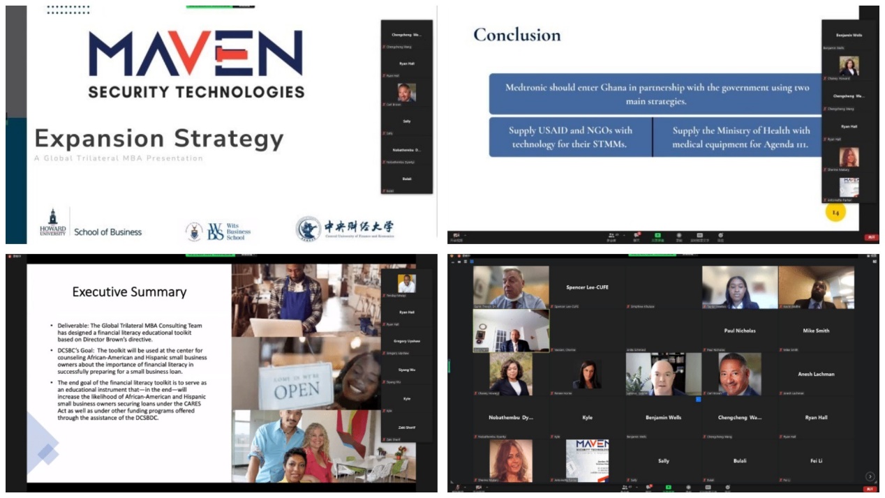 GTMBA项目是星空XK体育国际交流传统特色项目。疫情阻挡不住创新的脚步,也阻碍不了国际交流的热情,在星空XK体育官方网站、霍华德大学以及威茨星空XK体育的共同努力下,北京时间2021年11月10日22:00,三方师生克服时差困难,顺利完成了GTMBA全部咨询项目的展示汇报,标志着星空XK体育官方网站第六期GTMBA项目顺利落幕。