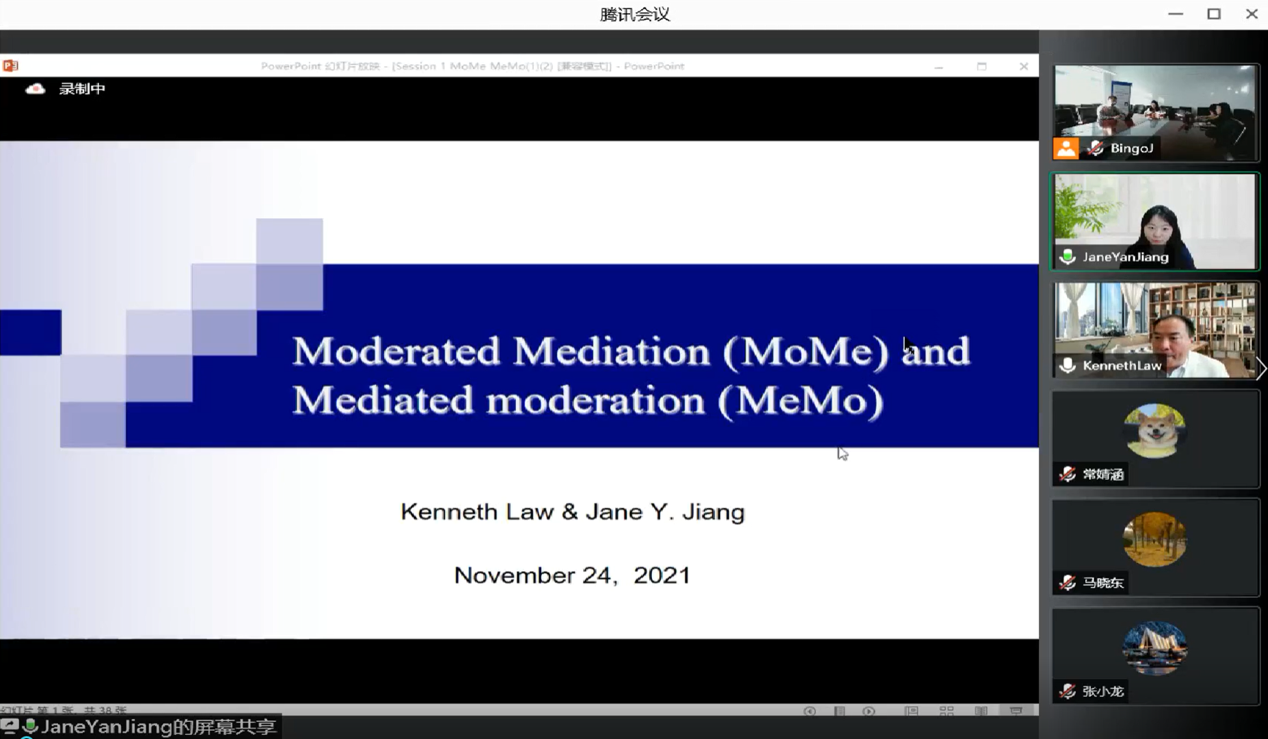 在上午的讲座中,姜嬿老师介绍了研究中复杂的中介效应和调节效应模型,具体包含中介调节和调节中介效应在研究者构建理论模型中的作用、模型的路径分析和基本原理,以及对模型进行检验的基本过程和方法。