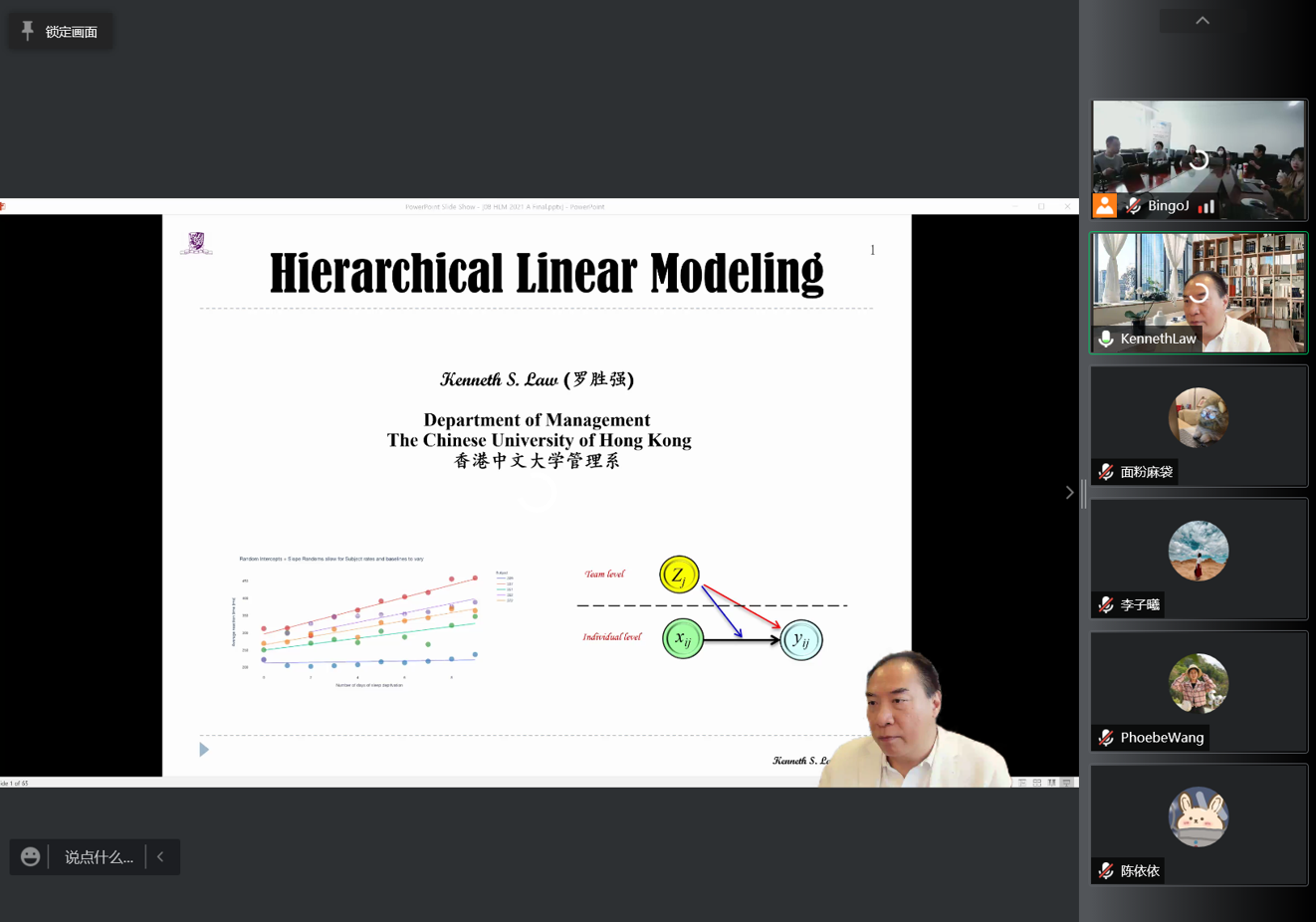 2021年11月24日,星空XK体育通过线上腾讯会议和线下会场(学院南路校区主教615会议室)结合的方式,开展了星空XK体育博士生科研能力提升项目第二期第2讲暨星空XK体育卓越学术讲坛第11期。本次讲坛分别邀请了南京大学姜嬿副教授和香港中文大学罗胜强教授作为主讲人,通过系列讲座形式对管理学研究方法中的中介调节与调节中介作用和跨层次分析方法进行了深入讲解。该讲座不仅吸引了本院师生踊跃参与,还吸引了来自各个高校的老师和同学们,每场讲座线上、线下参与人数都近400人。