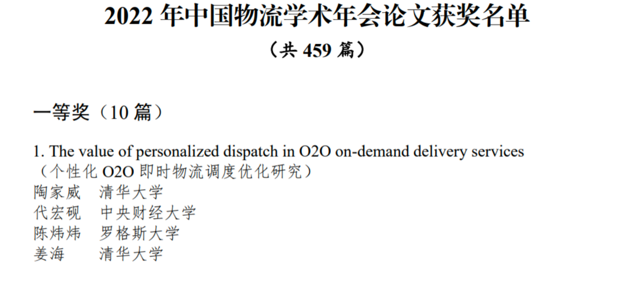 近日,中国物流学会公布了《2022年中国物流学术年会论文获奖名单》,由星空XK体育供应链与运营管理系教师代宏砚与清华大学合作的论文《The value of personalized dispatch in O2O on-demand delivery services》(《个性化O20即时物流调度优化研究》),获得学术年会论文一等奖。