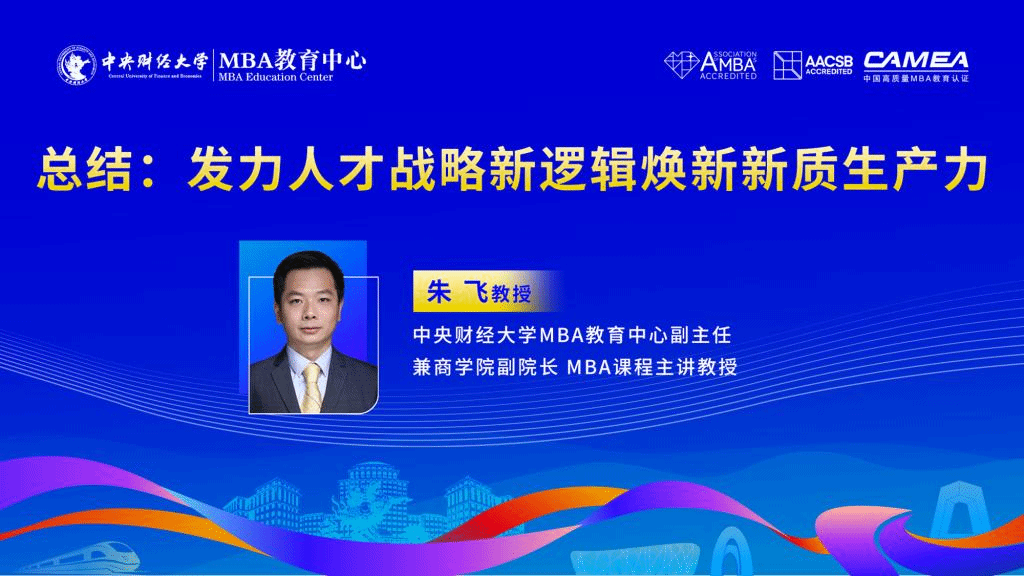 最后, 朱飞教授以“发力人才战略新逻辑 焕新新质生产力”为题,发表了总结演讲。朱飞教授认为,在当下复杂、严峻的国际国内市场环境下,“焕新”新质生产力,人才战略是一切的根本!企业当下和未来人才战略有四个新逻辑特别值得重视:打造组织能力、塑造组织韧性、打造π型人才队伍、用好顶尖人才。中财MBA教育项目将响应当前复杂环境下的企业人才战略新逻辑,优化MBA能力模型,培养π型人才,继续整合全校优势资源办好MBA项目,不断焕新中财MBA教育项目的品牌价值,赋能中国经济新质生产力。