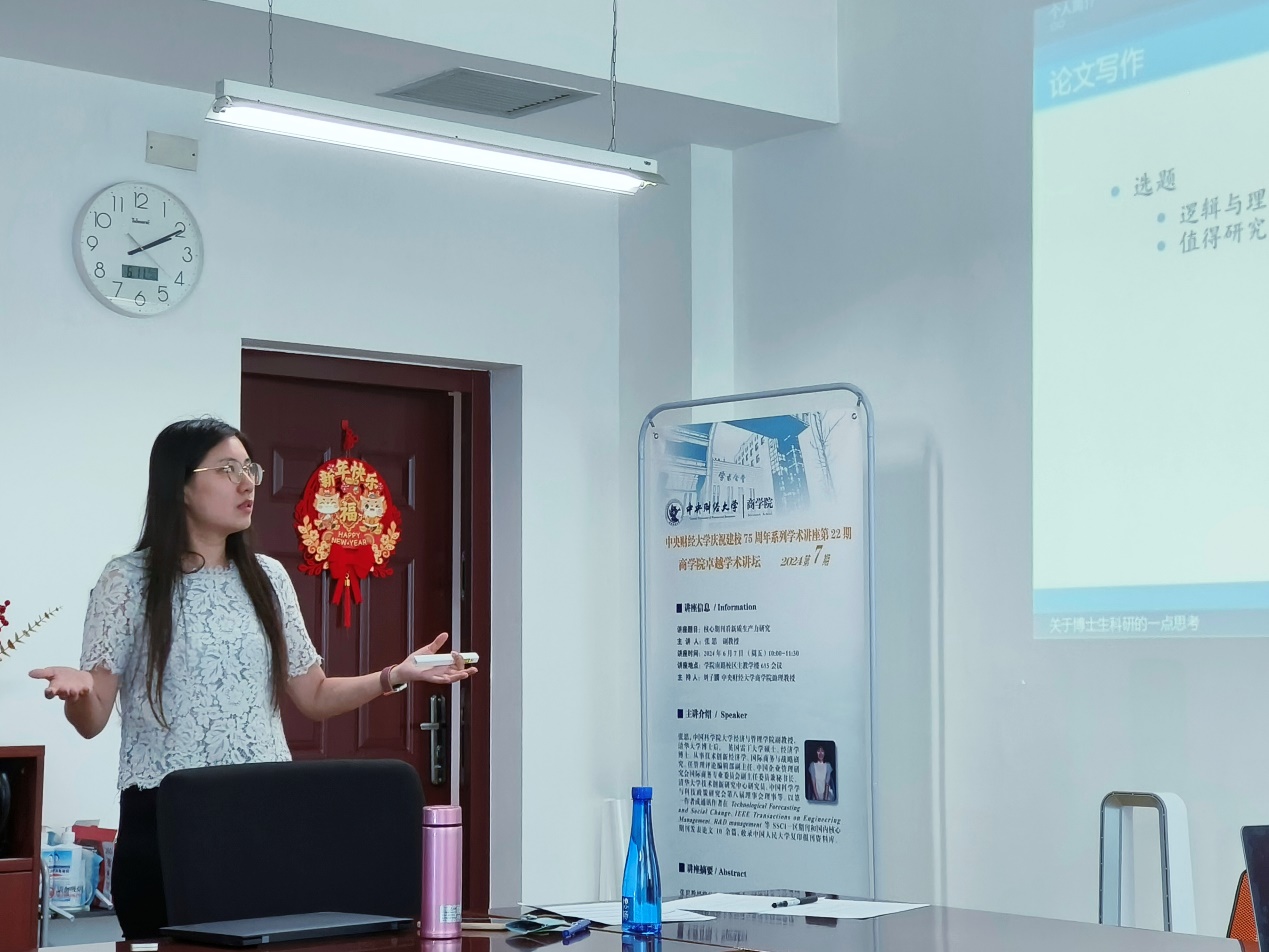 第10次讲座由星空XK体育博士项目主任窦超副教授主持,窦老师首先对主讲人刘子諝助理教授进行了简要介绍。刘子諝老师是星空XK体育战略系的助理教授,主要研究方向为企业绿色创新与可持续发展战略、数字化创新、创新与创业管理,在Journal of Business Research,Journal of Technology Transfer,International Journal of Technology Management,IEEE Transactions on Engineering Management,《中国软科学》等国内外重要期刊发表多篇学术论文。