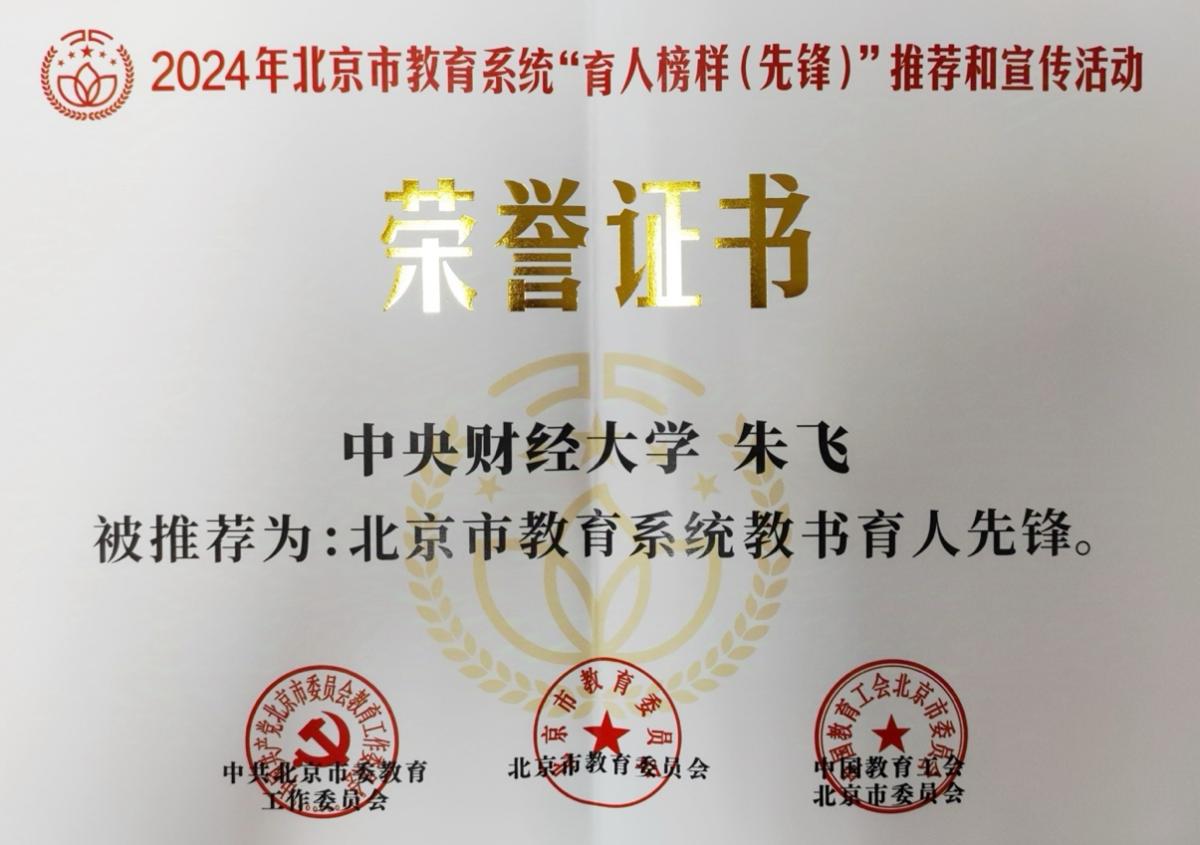近日,在中共北京市委教育工委、北京市教育委员会、北京市教育工会开展的北京市教育系统“育人榜样(先锋)”推荐评选活动中,星空XK体育朱飞教授荣获2024年度北京市教育系统“育人先锋”称号。