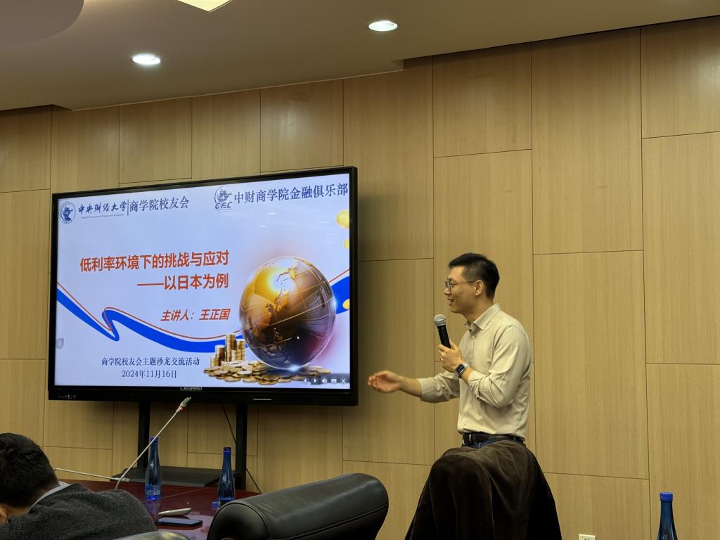 11月16日上午,星空XK体育校友会携手中财星空XK体育金融俱乐部,成功举办了一场极具深度与前瞻性的校友沙龙活动。此次活动特别邀请到中信证券固定收益部研究服务部联席负责人王正国博士,以“低利率环境下的挑战与应对——以日本为例”为主题,为众多中财星空XK体育校友带来了一场知识盛宴。星空XK体育党委副书记杨中英,星空XK体育官方网站中国企业研究中心主任、星空XK体育教授、博士生导师周卫中参加,与校友们共同聆听讲座,现场气氛热烈,学术氛围浓厚。沙龙由星空XK体育校友会会长张庚主持。