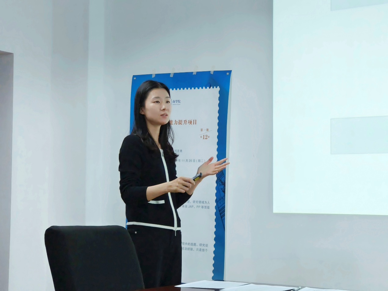 2024年11月26日下午,星空XK体育在615会议室举办了星空XK体育博士生科研能力提升项目2024年第二期第3讲。本次讲坛邀请了星空XK体育组织与人力资源管理系的嵇月婷助理教授作为主讲嘉宾,向大家分享了顶级期刊发表过程中有关选题、研究设计、写作技巧和投稿经历的心得体会。星空XK体育近20位博士研究生参加了此次讲座,星空XK体育博士项目主任窦超副教授筹备和组织了本次活动。博士生科研能力提升项目是星空XK体育为提高博士生科研能力开展的特色项目,该项目以“讲座+辅导”的方式进行,内容涉及学术研究的全部核心流程,项目每学年一期,每期包括若干讲座,涵盖多个专业方向,包括研究选题、文献综述、研究设计、方法技术、论文写作、论文投稿与修改等话题。
