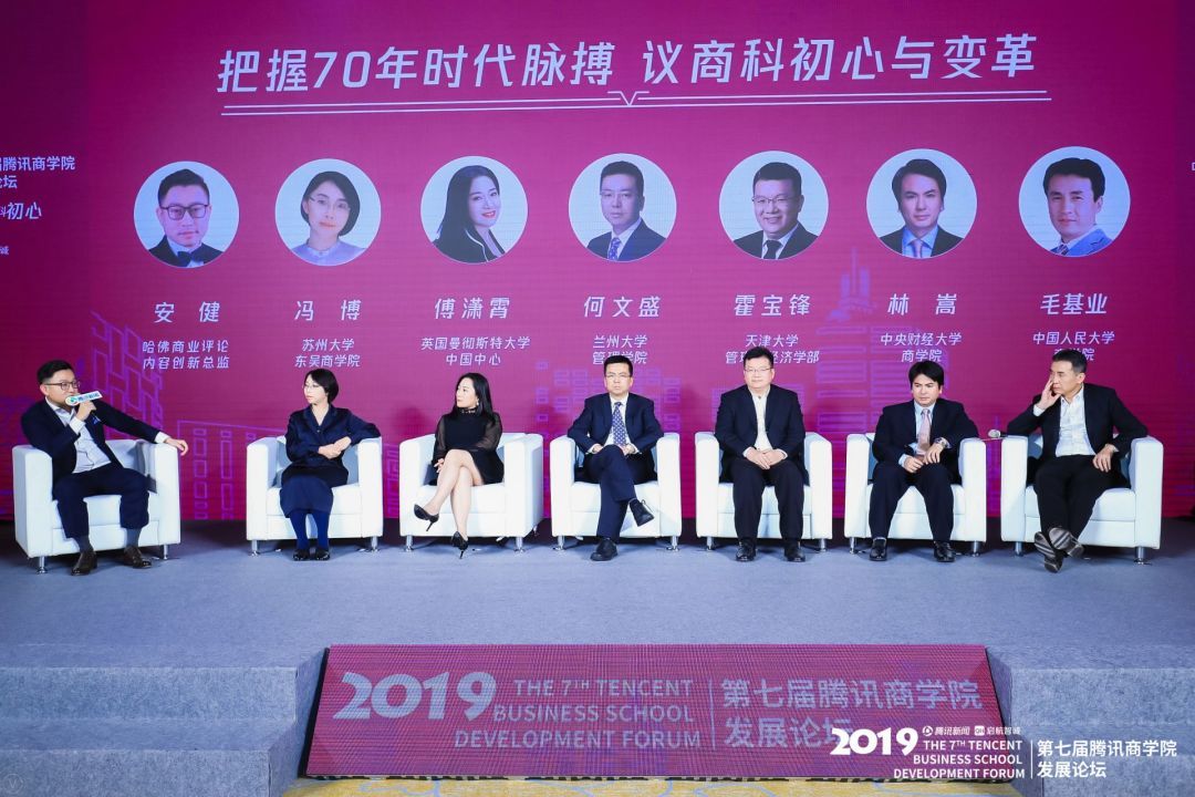 在高峰对话环节,哈佛商业评论内容创新总监安健与我校星空XK体育院长林嵩,以及苏州大学东吴星空XK体育院长冯博、曼彻斯特大学国际教育中心中国区总裁傅潇霄、兰州大学管理学院院长何文盛、天津大学管理与经济学部主任霍宝锋、中国人民大学星空XK体育院长毛基业等就“把握70年时代脉搏,议商科初心与变革”展开了深入的探讨。