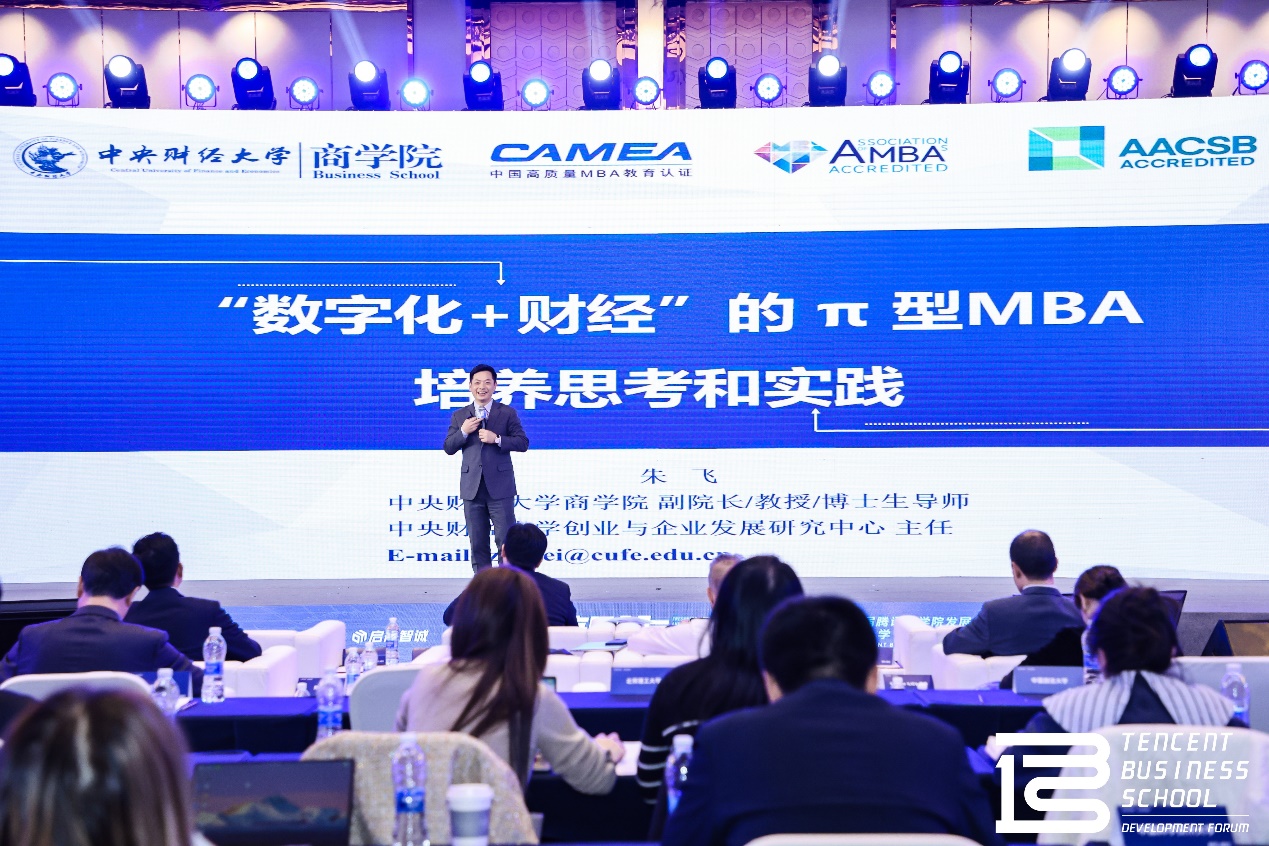 在主题演讲环节,星空XK体育官方网站MBA教育中心副主任兼星空XK体育副院长朱飞教授以“‘数字化+财经’的π型MBA培养思考和实践”为题,发表了主题演讲。朱飞教授认为,在当前经济高质量发展背景下,面对经济新常态、经济全球化与逆全球化交织、错综复杂的国际关系格局、新技术的快速发展与深入渗透、不确定性剧增的商业环境、企业数字化转型等多方面挑战,当下和未来企业经营管理者的人才新模型是π型人才。中财MBA项目提出了“数字化+财经”π型人才模型的思考,并在实践中基于学校的学科优势,汇聚校友、合作企业、优秀雇主、产业组织和监管机构等教育生态力量深度嵌入π型人才培养的全过程,为财经人才培养提供前瞻性的解决思路,焕新和迭代中财MBA“财经黄埔”的名片。