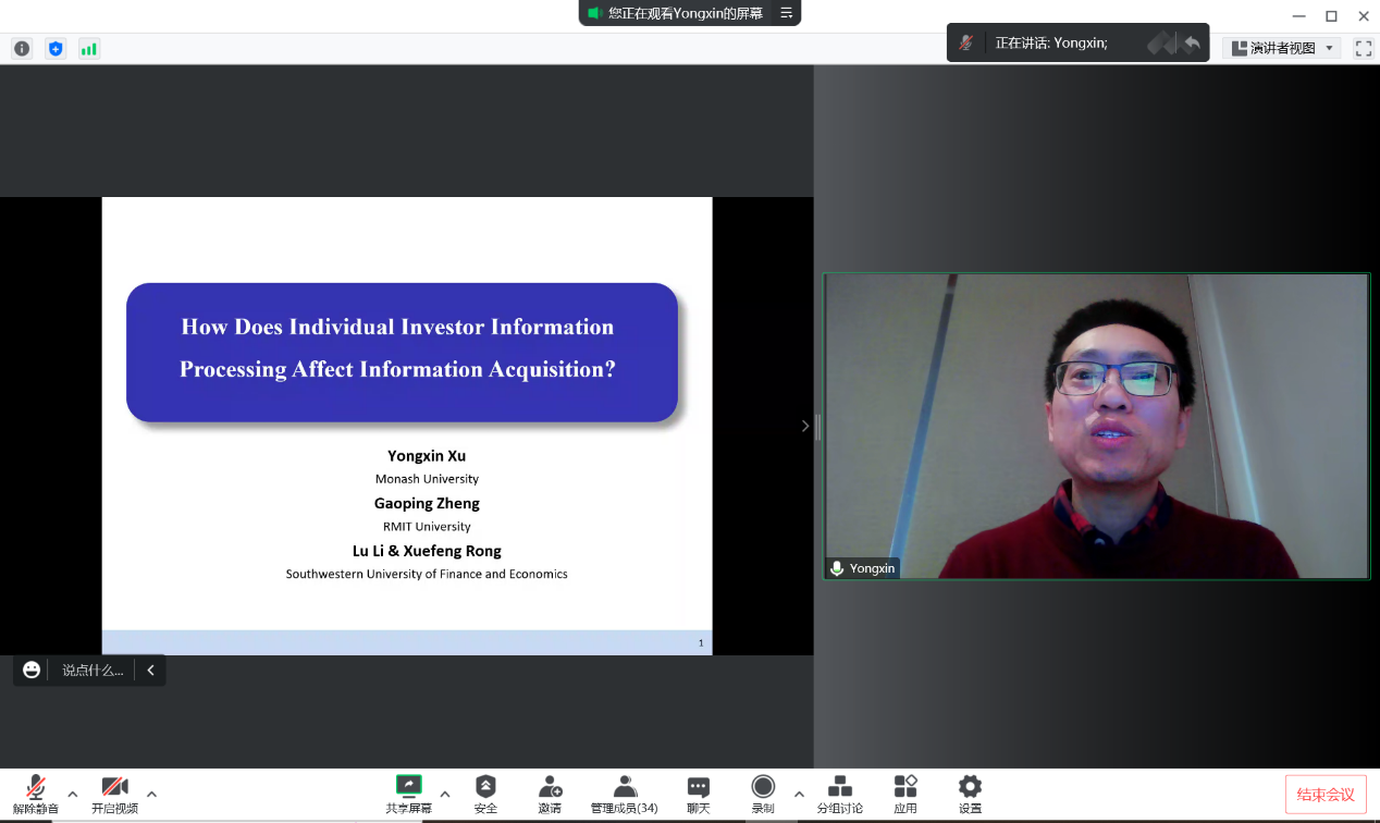 2022年09月27日中午12点,星空XK体育通过线上腾讯会议的方式,举办了2022年第十一期星空XK体育卓越学术讲坛。本次讲座邀请了澳大利亚Monash大学Senior Lecturer徐永新博士为主讲嘉宾,包括学院教师、硕博生和本科生在内,共三十余人出席本次活动。