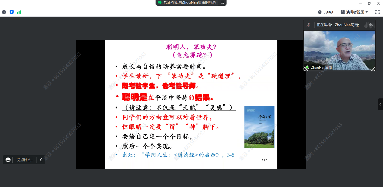 周南老师讲座的主题为“研究生培养:聪明人,笨功夫?”。周老师提出研究生的成长,既考验学生,也考验导师。做研究,“想”得一清二楚,才能“写”得明明白白。写论文,用阴阳图解释,包括四个具体的阶段。作为学生,应做到两个“善于”:善于展示进展,适时报告困惑;善于沟通,了解导师的风格,定期约见导师,及时解决疑难。作为导师,应做到两个“善于”:善于安排时间,善解人意,不可“居高临下”,而应该体贴学生,在关键处“点+拨”,让他们保持信心与动力,早日毕业。因此,聪明是在平淡中坚持的结果,下“笨功夫”是“硬道理”。