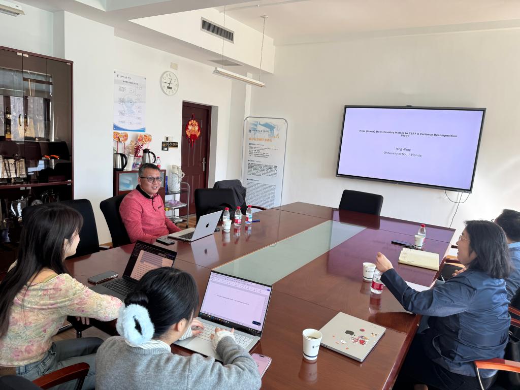 王唐老师是南佛罗里达大学星空XK体育Nault创业中心副教授,负责商业计划等方向的研究课程教学。主要研究方向聚焦在技术创业和创新管理,包括产品开发、学术创业和高层团队管理,研究主要关注高新产业,例如计算机、软件、生物科技、金融科技等,研究成果发表在顶级期刊,例如Strategic Management Journal,the Journal of Business Venturing, Journal of Product Innovation Management, Journal of Management, Strategic Entrepreneurship Journal等,多次荣获最佳论文奖。本次主讲的题目为“How (Much) Does Country Matter to CSR? A Variance Decomposition Study”。本次讲座内容主要关注将国家层面纳入CSR(企业社会责任)差异的分析中,扩展了CSR差异分解研究,揭示了国家特定因素在解释公司间CSR差异中的相对重要性。通过引入非正式制度(集体主义和个体主义价值观)作为调节变量,调节公司、行业和国家效应在CSR差异中的相对重要性,从而推进了对非正式文化规范如何塑造CSR差异的多层次理解。最后,研究提供了关于公司实质性CSR与象征性CSR差异来源的见解,表明象征性CSR差异更多地受到国家因素的驱动,尤其是在集体主义环境中。研究采用来自71个国家、153个行业、4287家公司的25309个样本数据(2003—2020年)进行理论验证,对于理解国内外的CSR战略具有启示意义。