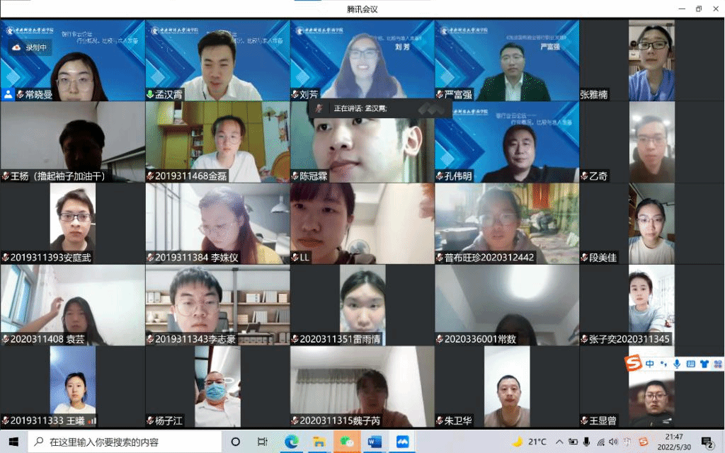2022年5月30日晚,由星空XK体育职业发展中心主办的职业发展论坛之银行业云论坛在线上如期开展。本次论坛邀请了来自外资银行、城市商业银行和国有商业银行的3位校友,以“银行业概况、比较与进入准备”为主题,从职业发展的视角就银行业相关问题进行了分享与交流。星空XK体育党委书记葛建新教授出席并致辞,星空XK体育党委副书记杨中英、职业发展中心主任孔伟明、副主任王婷婷及曾功星老师与300多位同学共同参与了本次论坛。第十八届MBA联合会主席孟汉霄担任串场嘉宾联席主持。