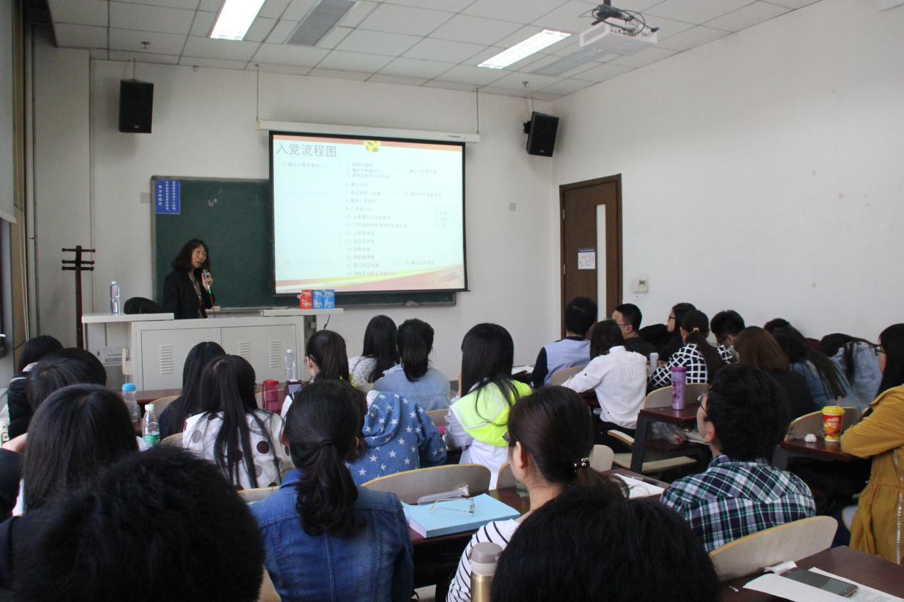 此次党课有一个深刻的主题——做合格的共产党员。韩老师从端正入党动机入手,围绕坚定理想信念角度展开党课。课程伊始,韩老师为所有积极分子推荐了几本必读书目——《中国共产党章程》、《共产党宣言》、《为人民服务》、《纪念白求恩》。这几份读物都可以帮助同学们对党组织有进一步的了解,并从中体会中国共产党人的精神内涵。在党课中,韩老师着重为同学们介绍了党的性质,党员的条件、标准和义务以及从普通人到党员的过程。当介绍到我们敬爱的毛主席的时候,老师为大家细致分析了毛主席的胸怀和伟大的理想。结合毛主席气势磅礴的诗词如“万类霜天竞自由”、“数风流人物,还看今朝”等等,我们不仅可以体会到毛主席对投身革命事业的热情和决心,更能感受共产党先烈们奋不顾身敢为天下先的豪迈气概。积极分子们被韩老师的热情感染,被毛主席的伟大折服,为共产党先烈们的豪迈气概倾倒,听得聚精会神。