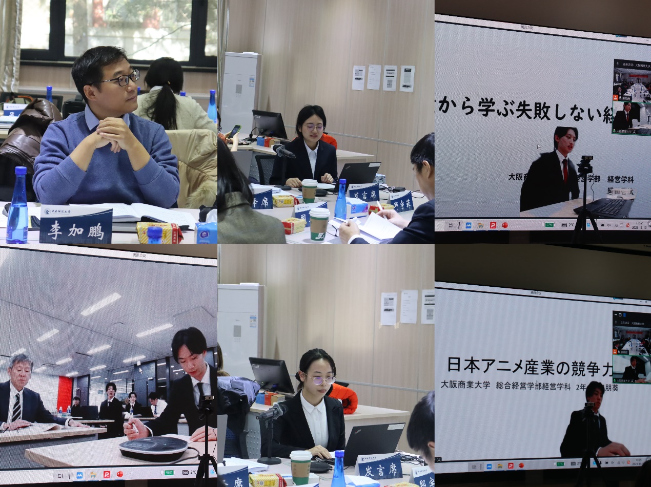 汇报结束后,星空XK体育官方网站周卫中教授和大阪商业大学北室康一准教授分别对学生的报告内容和汇报表现进行点评。周卫中教授对本届研讨会演讲学生的选题和现场表达给予了高度肯定。同学们能够关注到自己生活环境中非常重要的现实问题,这本身就值得鼓励。对于每位学生展示方案的改进,周教授从理论与实践两方面提出了中肯的建议。作为中方教师,周教授感谢两校师生的共同付出,奉献了一场如此精彩的研讨会。北室康一准教授对学生们“找真问题”“挖掘本质”的研究作风表示赞扬,并再次感谢学生们的辛苦付出。
