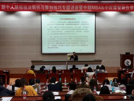 At14:00 on January 12, 2019, sponsored by the MBA Tax Club of Central Universityof Finance and Economics (CUFE) and co-organized by Zhongcaihuizhi (Beijing)Enterprise Management Co., Ltd., the lecture on “Interpretation of NewIndividual Income Tax Law and Tax Planning Skills” was held successfully inRoom 202 of the Academy Hall of CUFE. The featured guest of the event was ChengLiyuan, General Manager of The Tax Cinda. As a practitioner in tax authoritiesfor over ten years, Mr. Cheng served the posts of tax administration staff,head of tax inspection department, and head of tax collection departmentsuccessively. Boasting work experience in a number of Fortune 500 multinationalcompanies and listed companies, he has profound expertise inproblems inenterprises’ tax management, with an acute insight into and judgment of the latesttax policies and tax forms.