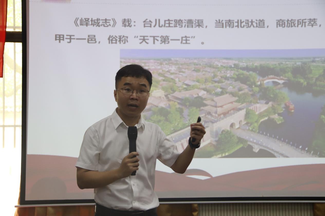 台儿庄区委党校校委会委员、高级讲师李欣以《铭记抗战英烈 传承抗战精神》为主题,通过视频影像和生动讲述,回顾了台儿庄大战的激烈战况,展现了中国军队英勇抗敌的壮烈历程,阐释了勇于牺牲、甘于奉献、精诚团结、反抗侵略的崇高精神,号召全体学员传承红色基因,将爱国情怀转化为奋斗动力。