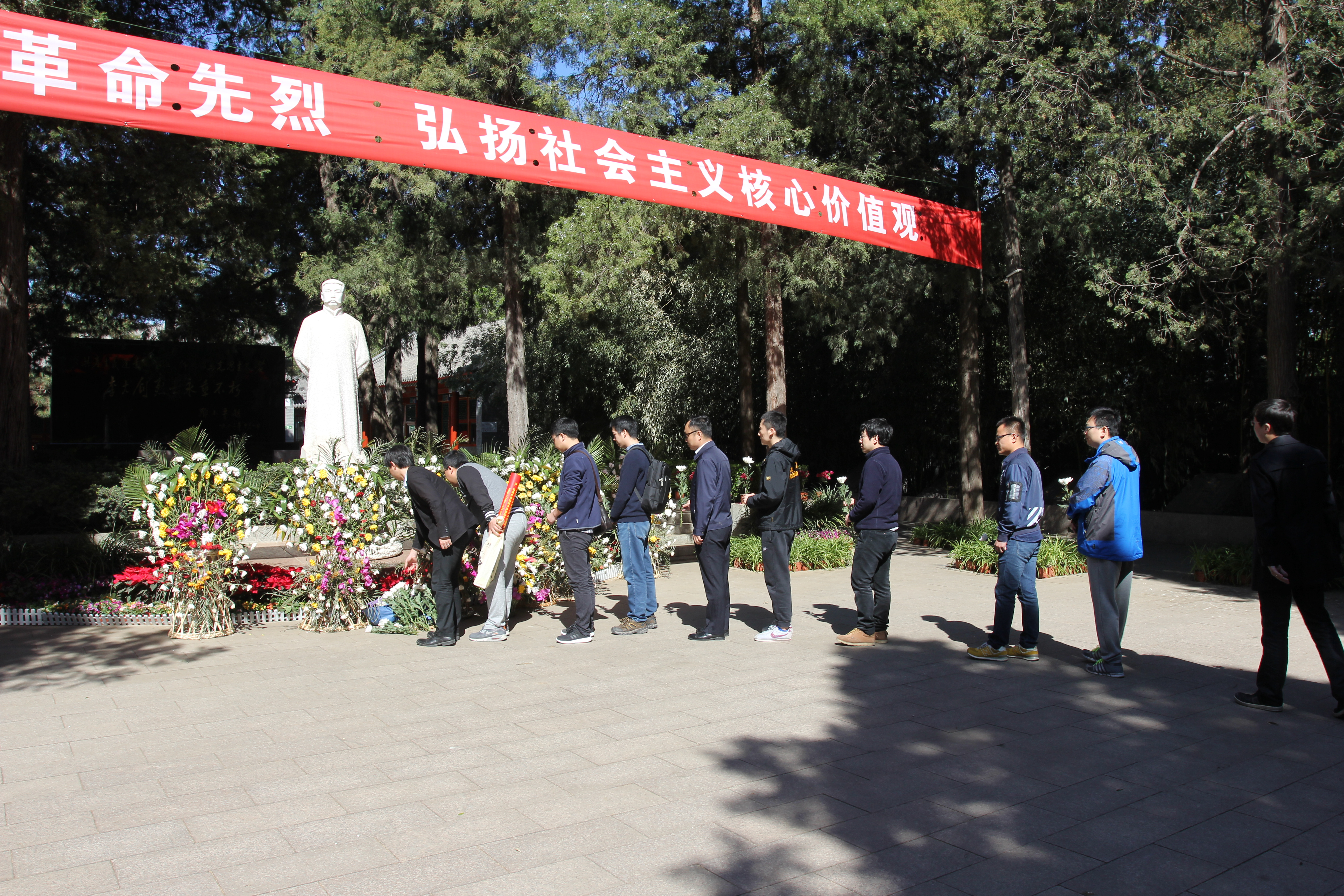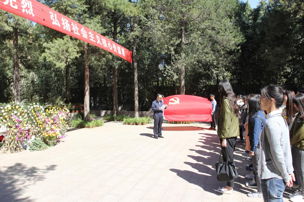 第一环节是祭扫仪式:进入李大钊陵园,党员和积极分子们首先为李大钊烈士集体默哀,由积极分子代表以及学员依次为李大钊烈士扫墓献花,表达对李大钊的崇高敬意。党课学员代表张世尧、刘重庆,党员代表向凌君发表感言。他们对革命先烈不怕牺牲,为共产主义事业献出生命的伟大精神致以敬意,并告诫我们要珍惜现在的幸福生活,号召我们践行社会主义核心价值观,学习革命精神。