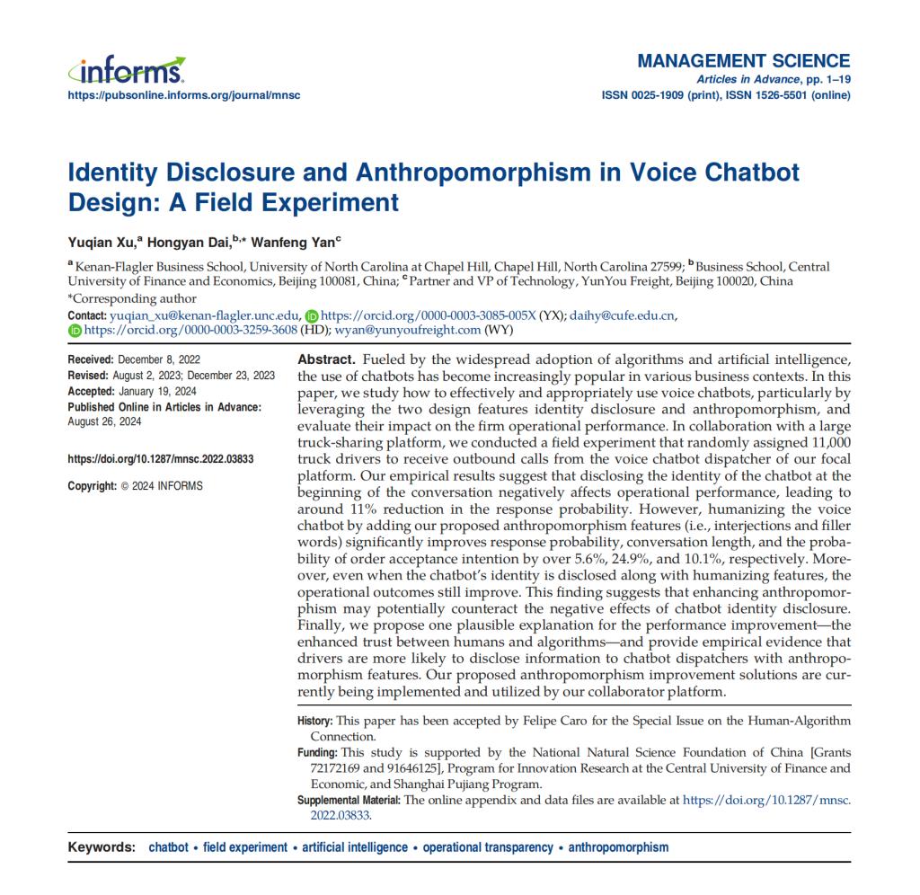 近日,星空XK体育代宏砚教授与北卡罗莱纳大学教堂山分校Yuqian Xu教授及云柚货运合伙人兼技术副总裁闫晚丰合作撰写的论文《Identity Disclosure and Anthropomorphism in Voice Chatbot Design: A Field Experiment》在国际顶级学术期刊《Management Science》发表,代宏砚教授为通讯作者。代宏砚教授于2023年在《Management Science》上成功发表论文《The Interplay of Earnings, Ratings, and Penalties on Sharing Platforms: An Empirical Investigation》,研究众包劳动力的行为和激励问题。仅时隔一年,再获佳绩。
