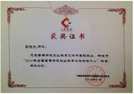 王瑞华院长荣获“2014年全国高等学校创业教育工作先进个人”称号
